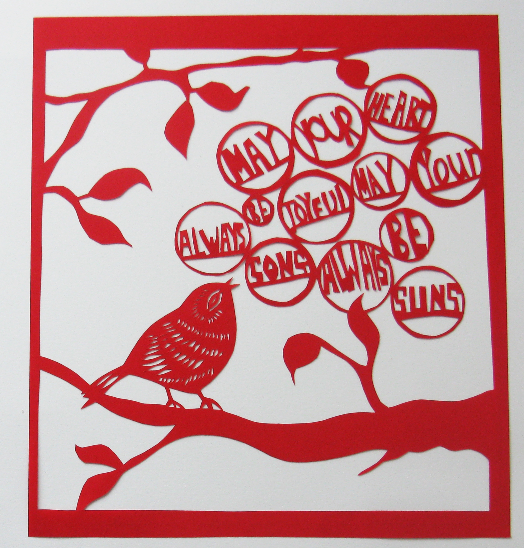 I made a papercut for my partners birthday last year, using the lyrics from the song “Forever Young”, which I think was originally written by Bob Dylan. I love the line “May your heart always be joyful, may your song always be sung” and thought the words were a nice wish for a newborn baby..anyway so here is my effort – Please remember that I am just a beginner at this, and will never be as good as these people above…but I love experimenting! I’ve taken some photos along the way so you can see the stages. (You can see the pictures more clearly if you  click on them)