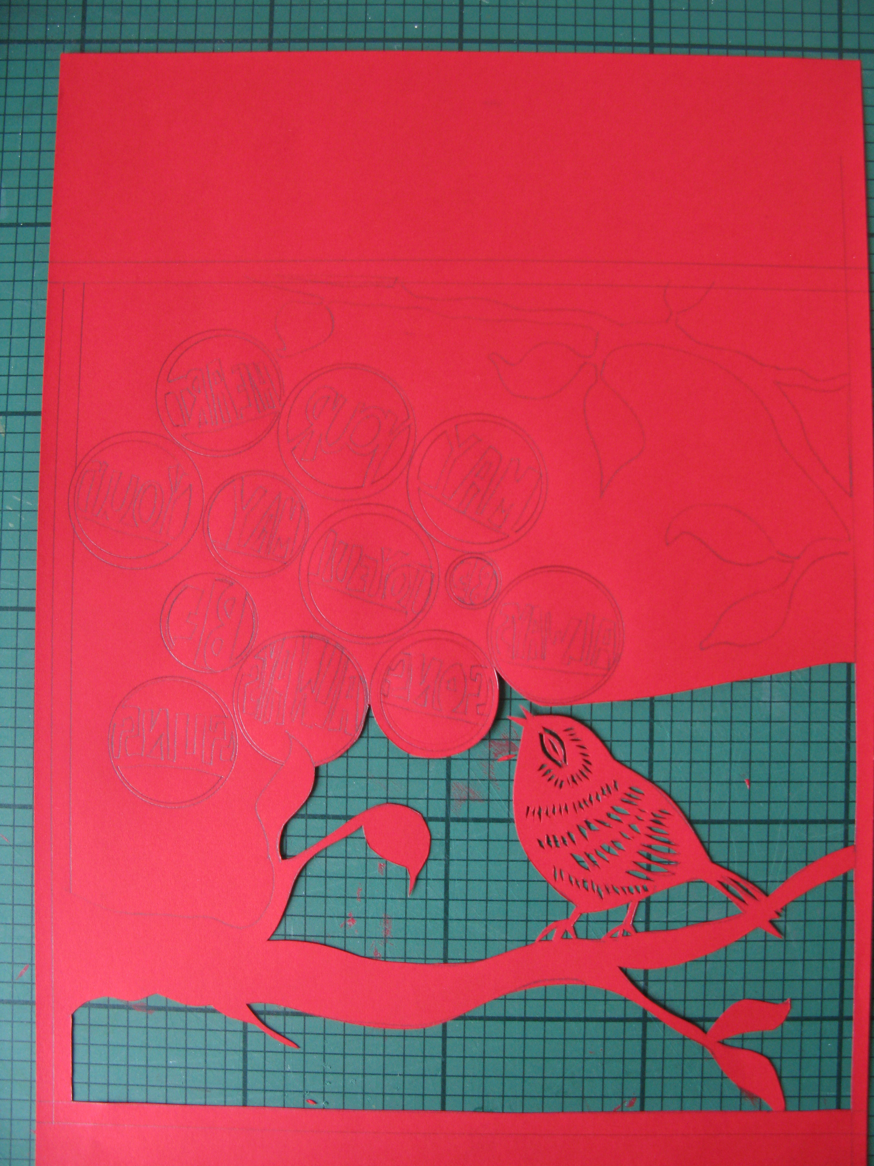 Stage 2 - beginning to cut - I did the small feather details first before cutting out the bird, to keep the paper stable.