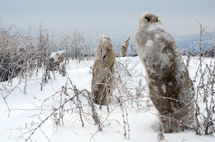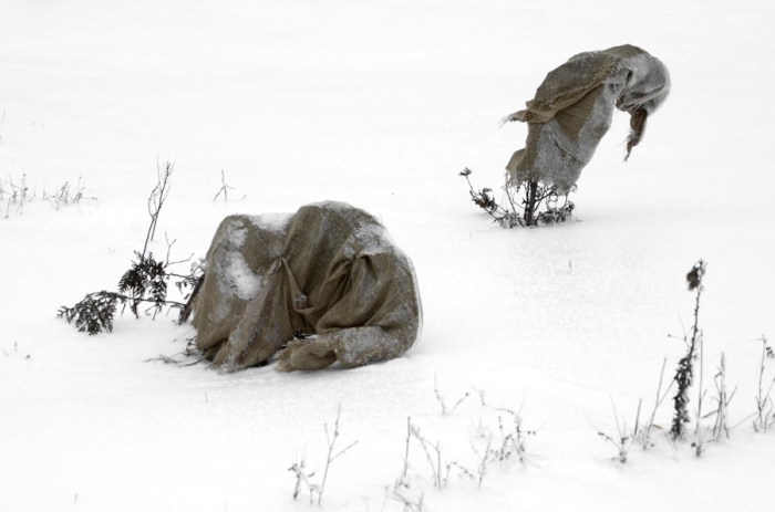 When I did go back to photograph them the first time I felt like there was a bit of majesty to them. Everything was sparkling from freezing rain and there seemed to be this quiet energy among them. In the winter the images were much more solemn, it was a grey shadowless day and they were literally weighed down by the weight of the weather. Burdened. And the raggedness of their cloaks brought out more character in them, the shapes changing with weather.”