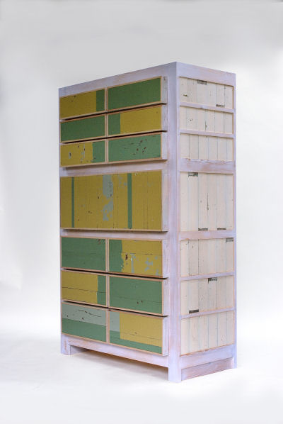 “Salvaged painted wood is a waste product of urban renewal and unlike the natural unfinished wood varies a great deal in visual character. Collecting and responding to this material is a new situation every time and involves a more conscious image building process, making each coloured piece of furniture more unexpected and unrepeatable.”