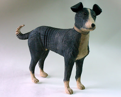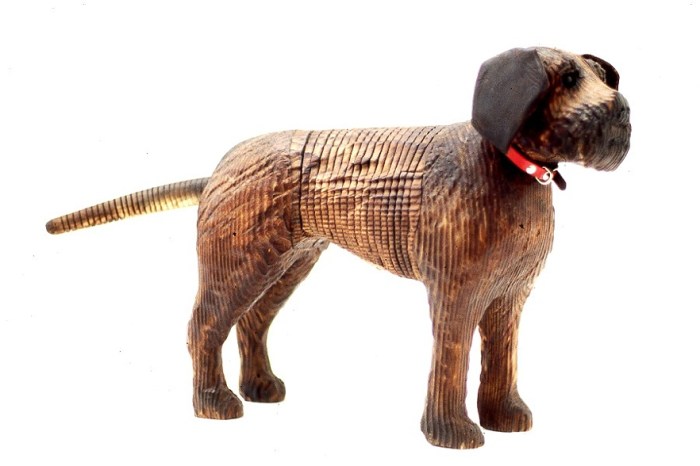 I have to smile a little that this Border Terrier is made of Douglas Fir. Jeff has made crocodiles from this wood too, as he likes the “reptilian texture”. Hammered, scraped and gouged, it certainly gives a pleasingly furry impression to this little dog, with a really “muzzley” muzzle. (Yes I made up that word.)